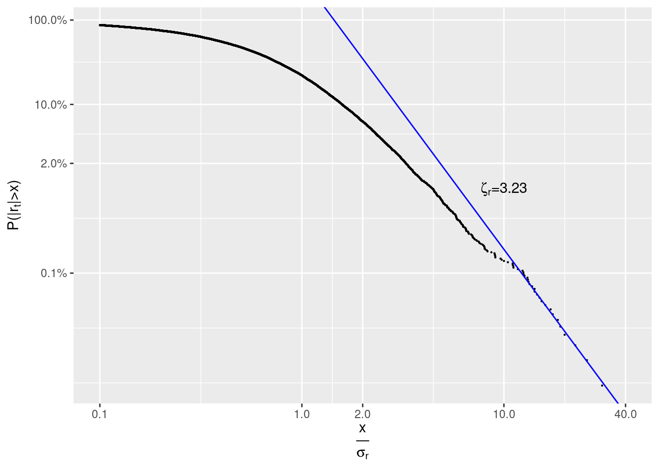 scale_y_log10(TeX('$P(|r_t| > x)$'),